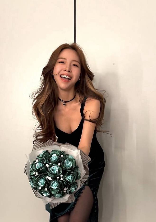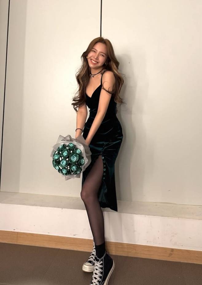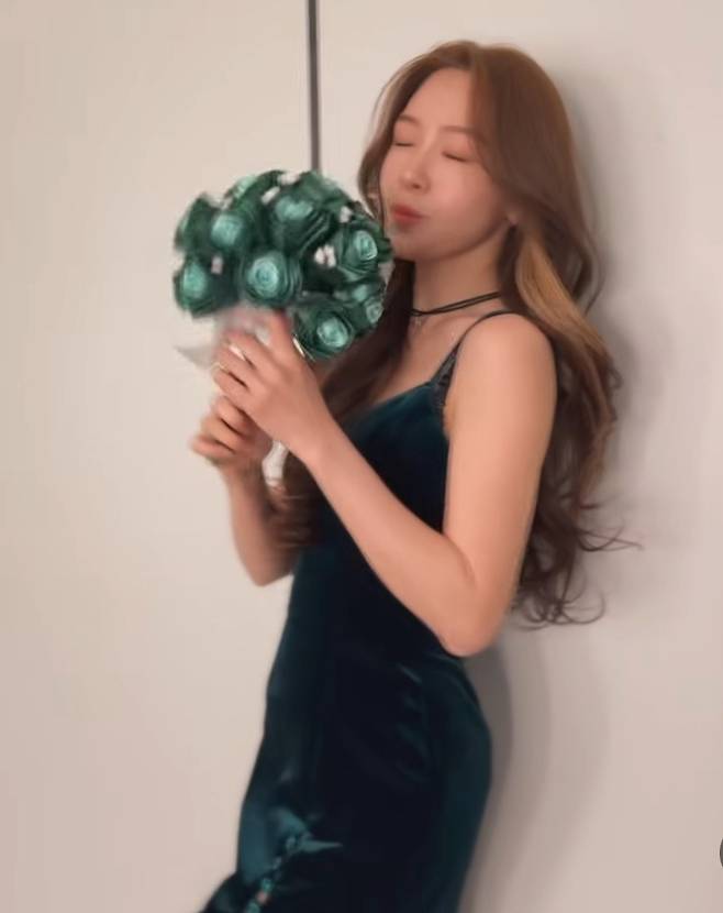 방민아는 블랙 벨벳 슬립 드레스를 착용해 고급스러운 무드를 연출했습니다.