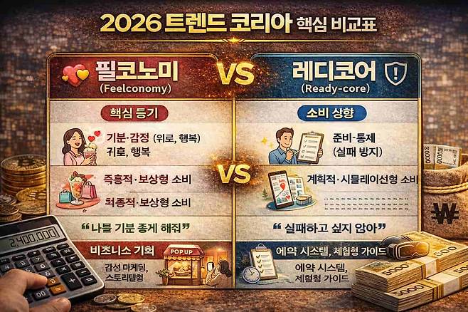 2026년을 장악할 두 가지 트렌드 키워드,필코노미(Feelconomy)와 레디코어(Ready-core)는사람들이 왜 돈을 쓰는지, 그리고 어떻게 불안을 관리하는지를 정확히 보여줍니다.