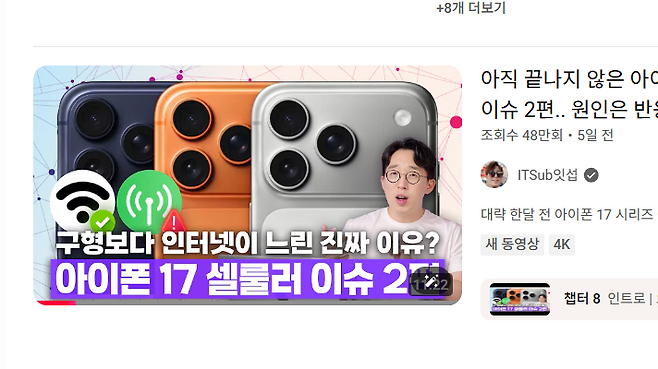 특히 일부 이용자들은 "와이파이와 셀룰러가 번갈아 끊긴다"며 답답함을 호소하고 있죠. 유튜브에서도 이 문제를 직접 다루는 영상이 잇따르고 있습니다. 잇섭, 테크몽 같은 IT 유튜버들이 실제 테스트를 진행해 "아이폰17 속도" 이슈를 보여주고 있습니다. 문제는 단순한 불편을 넘어, 제품 결함으로 의심될 만큼 반복되고 있다는 점입니다.