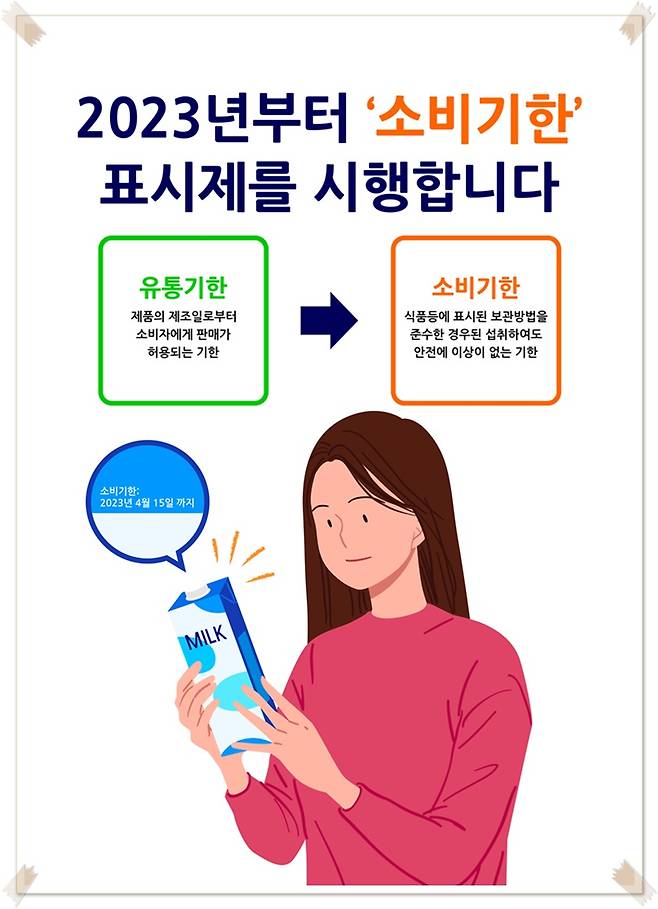 한편 지난 2021년 12월 ‘식품 등의 표시·광고에 관한 법률’이 개정되면서 유통기한 표시제가 소비기한 표시제로 전환되었는데요. 2023년도 1월부터 영업자는 기존 유통기한 대신 소비기한을 표시해야한다고 해요. 물건 살 때 참고하시길 바랄게요~^-^