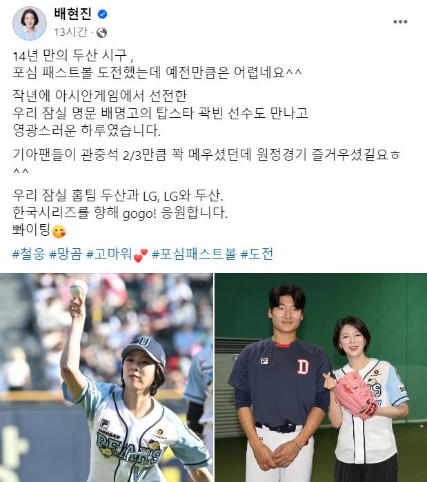 이후 배현진 의원은 자신의 SNS에 "14년 만의 두산 시구, 포심 패스트볼에 도전했는데 예전만큼은 어려웠다"라며 소감을 밝혔다.