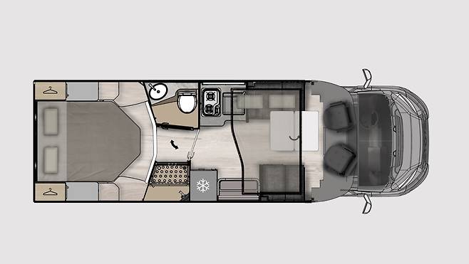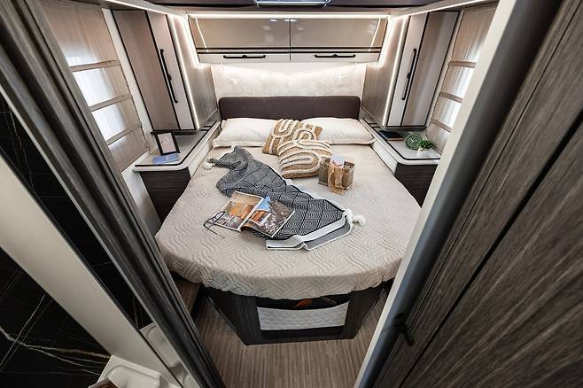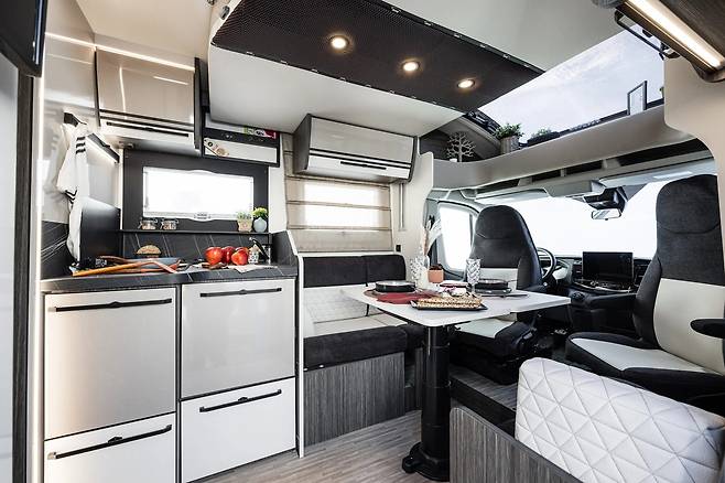 이 모델의 핵심은 전면 라운지 공간이다. 운전석과 조수석이 회전 좌석으로 구성돼 측면 벤치, 중앙 테이블과 함께 U자형 거실 공간을 완성한다. 천장처럼 보이는 곳에는 숨겨진 전동식 침대가 탑재돼 있으며, 버튼 하나로 2인용 침대가 내려온다. 침대는 창과 겹치지 않도록 설계돼 탁 트인 시야도 확보했다.