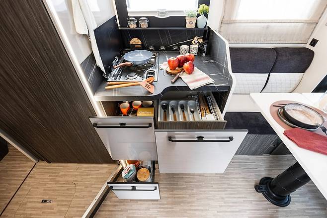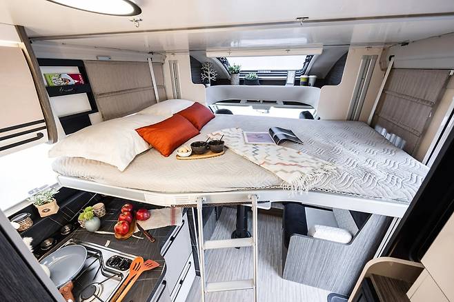 후면에는 계단이 있는 중앙 고정식 침대가 배치됐으며, 침대 하단에는 넓은 수납공간과 외부에서 접근 가능한 ‘기어 차고’도 마련돼 있다. 이는 유럽식 캠퍼다운 실용성이 돋보이는 구성이다. 일부 구역에는 이중 바닥 구조를 활용한 바닥 수납공간도 숨겨져 있어 장거리 캠핑이나 사계절 생활에 최적화돼 있다.