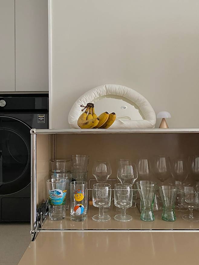 usm 장 위에는 좋아하는 유리잔들이 들어있어요. 옷장 쪽으로 건조기를 설치하여 건조가 다 된 후 옷 정리하기도 너무 수월해요.
