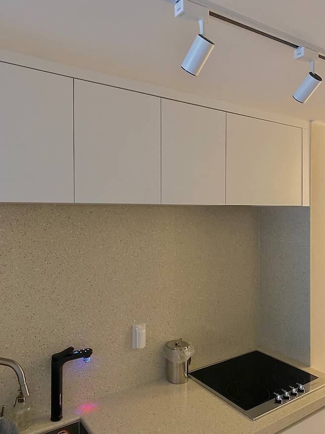 다른 곳의 조명에 포인트 들을 많이 주어 주방 조명은 깔끔하게 레일 조명으로 선택했는데 깔끔한 디자인이 아주 맘에 들어요.