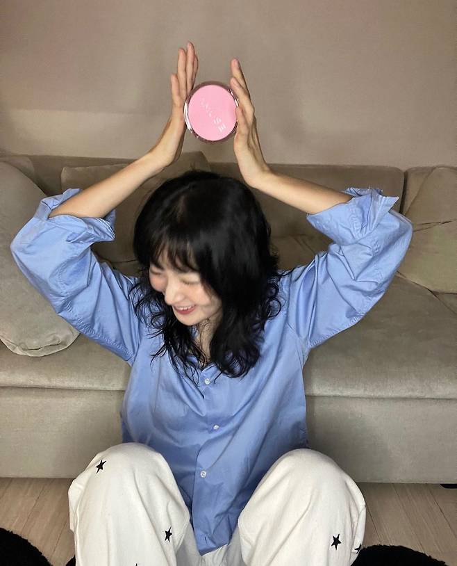 슬기는 블루 셔츠와 화이트 데님 팬츠를 매치했습니다.