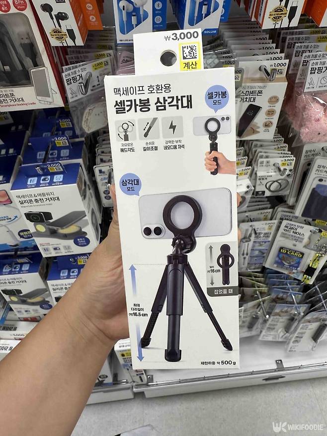 다이소에서 판매하는 맥세이프 호환용 셀카봉 삼각대는 단돈 3000원이다. 시중에서 판매되는 맥세이프 호환 삼각대는 평균 5만 원을 넘는 경우도 많은데, 비교해도 놀라운 가격대라는 점이 눈길을 끈다. 물론 가격대가 있는 삼각대와 단순히 비교하긴 어렵겠지만, 맥세이프 호환이 되는데도 이 정도 가격이라면 가성비가 뛰어나다는 평가를 받고 있다.