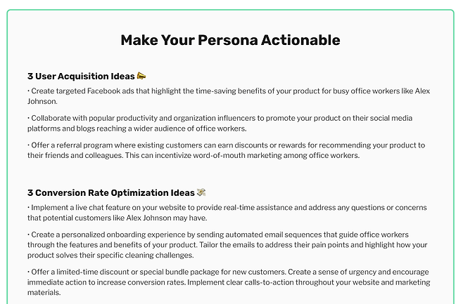 - 페르소나는 물론 사용자 경험과 전략과 관련된 다양한 정보를 생성할 수 있어요.