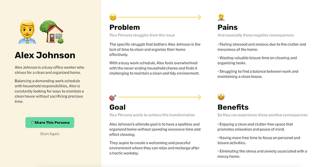 서비스 URL을 입력하는 것만으로 적합한 유저 세그먼트를 추천해준다는게 가장 흥미로웠던 점이었어요. 위 이미지에서 보시다시피 'My website is' 를 클릭하고, 원하는 세그먼트를 입력하면 더 자세한 페르소나 정보를 확인할 수 있어요. 위와 동일한 가상의 서비스로 한 번 시도해 봤는데요! 문제점, 페인 포인트, 기대하는 바까지 한 번에 확인할 수 있었습니다. ChatGPT가 만들어준 결과는 아래와 같아요.