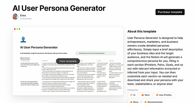 세 번째로 소개하고 싶은 건, 노션에서 제공하고 있는 템플릿 중 하나인 AI user Persona Generator예요.