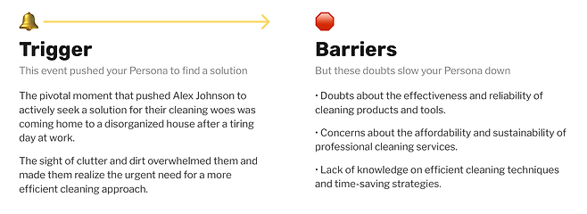 결과에 포함하진 않았지만, 페르소나가 문제를 가장 해결하고 싶어하는 순간과 우리가 무너뜨려야 하는 장애에 대한 내용도 함께 확인할 수 있어요. 꽤 구체적이인 상황을 가정하고 있음은 물론이고 6가지 주요 내용에 따라 결과를 확인할 수 있다는 점 또한 매력적이죠.