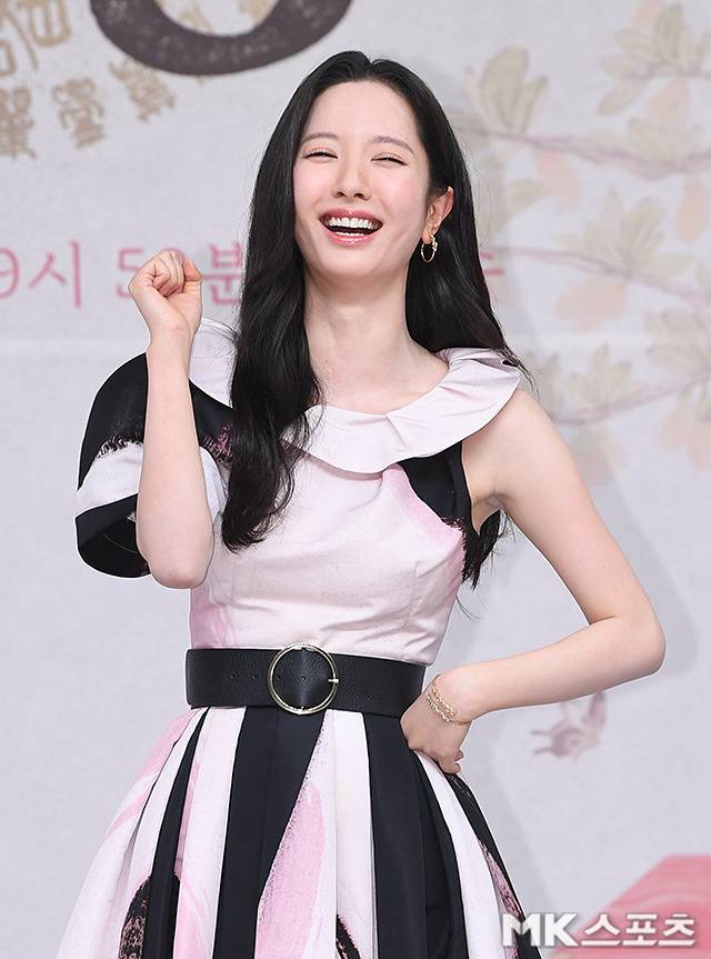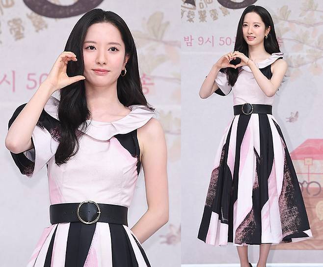 부드러운 핑크와 블랙이 조화된 플레어 롱 원피스를 선택한 김지연은 여신 같은 자태를 뽐냈습니다.