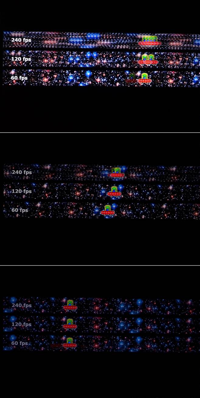 주사율 테스트하면 가장 많이 하는 테스트가 UFO주사율 테스트입니다. DSLR 셔터 스피드를 60, 125, 500으로 맞추고 240㎐에서 찰영해 보았습니다. 상단부 셔터 스피드 60에서 찰영하니 240fps에서는 UFO가 많이 겹치는 것을 볼수가 있으며, 가운데 찰영은 DSLR 셔터 스피드 125로 찰영해보았습니다. 60fps과 120fps의 프레임이 확연히 찍히지만 240fps에서는 여전히 UFO가 겹칩니다.
