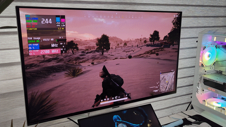 FPS하면 배틀그라운드를 빼놓을 수 없습니다. 4K 해상도의 풀옵션에서도 평균 270프레임을 넘기며, 240㎐ 주사율을 지원하는 오디세이 G8로 매끄러운 플레이가 가능합니다. RPG 모드에 비해 FPS모드는 레드 컬러가 살짝 높아지며, 0.03ms의 빠른 응답 속도(GtG)로 확연히 부드러운 퍼포먼스를 제공합니다.