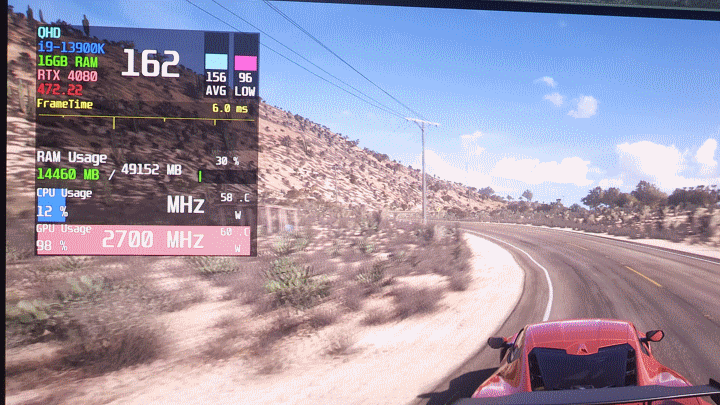 레이싱 게임으로 가장 많이 즐기는 호라이즌 5에서는 배틀그라운드와 다르게 4K에선 프레임 방어가 조금 힘들었지만, 평균 156프레임을 보여주며 원활한 플레이가 가능합니다. 무엇보다 QHD와 4K에서 보여지는 압도적인 그래픽 퀄리티는 게임의 몰입감에서 빠져나오지 못하고 한참을 하게 만들었습니다.