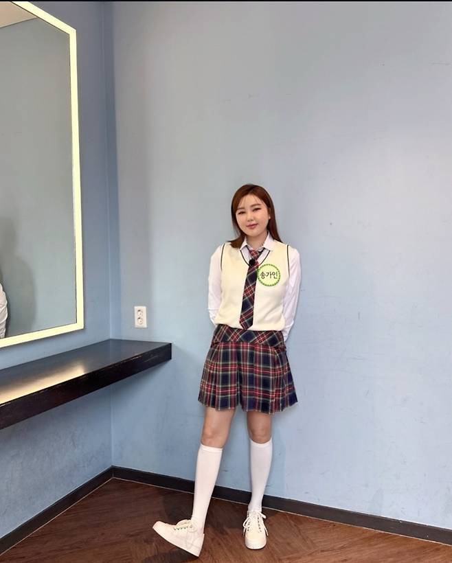 송가인은 발랄한 교복룩으로 동안 매력을 뽐냈습니다.