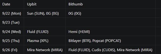 지난주 한국에서는 업비트가 Sun, 0G, Fluid, Plasma, Mira Network를 상장하고 빗썸이 0G, Hemi, Bitlayer, Popcat, Fluid, Cudis, Mira Network를 상장하면서 또 다른 상장 붐이 일었습니다. 업비트의 거래 활동은 XPL(26.7B USD)이 주도했고, 그 뒤를 이어 XRP(15.5B USD)와 OG(13.7B USD)가 뒤따랐으며, USDT, AVNT, ETH, BTC, SOL과 같은 주요 토큰의 거래량도 강세를 보였습니다. MIRA, BARD, DOGE, FLUID와 같은 중형 및 신흥 토큰도 활발한 활동을 보이며 광범위한 투자자 참여를 보여주었습니다. 빗썸에서는 USDT(15.7B USD)가 거래량 최고치를 기록했으며, XRP, ETH, BTC, SOL이 여전히 활발했고 WLD, PUMPBTC, AVNT, PENGU, UXLINK와 같은 투기성 토큰도 상당한 관심을 받았습니다.