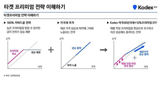 “100% 커버드콜 전략의 하락장에서 손실 방어 효과와 횡보장에서 수익 효과는 장기적으로 안 좋을 수 있다. 이를 완충하는 장치가 ‘타겟 프리미엄’이다. 기초자산을 100% 매수하고, 매월 목표 프리미엄을 수취할 수 있는 비중만큼만 콜옵션을 매도한다. 기초자산 가격의 움직임을 따라가면서도 옵션 프리미엄을 얻을 수 있는 ‘하이브리드 커버드콜 전략'이다. 그래서 최근 삼성자산운용에서 타겟 프리미엄 전략을 활용한 3종 상품을 새로 내놨다. Kodex 미국배당+10%프리미엄다우존스, Kodex 미국AI테크TOP10+15%프리미엄, Kodex 미국30년국채+12%프리미엄(합성H)다.”
