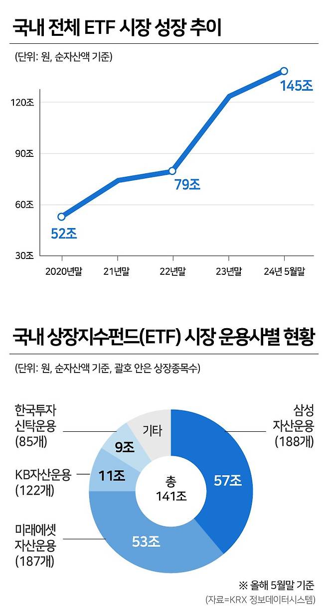 투자자가 요즘 투자할 맛이 나는 상품군 중 하나가 ETF(상장지수펀드)다. ETF는 펀드를 상장시켜 주식처럼 실시간 거래할 수 있도록 만든 상품이다. 펀드보다 수수료가 낮고, 주식·채권·부동산 등 여러 자산을 조합해 꾸준한 수익을 만들 수 있어 인기가 높다. ETF 시장 규모는 5월 말 145조원을 넘겼다. 2020년 말 52조원에서 3배 커졌다.