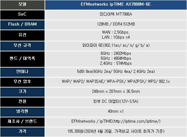 참고로, ipTIME AX7800M-6E는 멀티 코어 2.0GHz 속도로 동작하는 쿼드코어 ARM Cortex-A53 미디어텍 MT7986A SoC와 128MB 낸드 플래시, DDR4 512MB 메모리를 탑재했다.