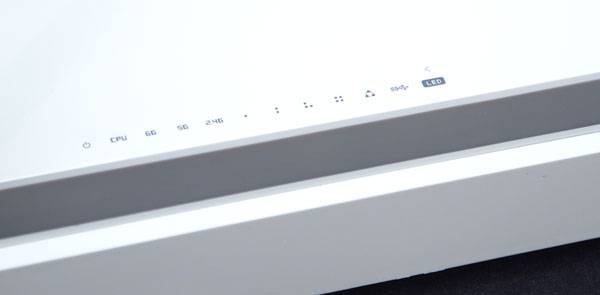 ipTIME AX7800M-6E의 주요 기능의 동작 여부는 상단 전면 히든 LED를 통해 직관적으로 확ㅇ니할 수 있다. 각 LAN과 WAN LED는 뒷면 배치와 그대로 대응, 네트워크 케이블에 라벨을 붙이지 않고도 특정 포트의 이상 유무를 쉽게 파악할 수 있다.