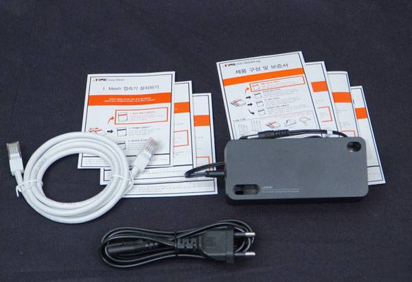 ipTIME AX7800M-6E는 본체를 포함해 어댑터(12V-3.5A), CAT6 케이블, 공유기 활용을 위한 메뉴얼도 제공된다. 특히 전원 어댑터의 경우 단순히 직육면체 디자인을 탈피해 ipTIME 공유기 본체 디자인을 이어받았으며, 그 연장선에서 동작 LED도 음각된 부분에 담았다.
