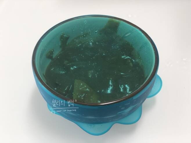 가장 큰 파란색은 밥그릇 사이즈입니다. 남은 밥 카레 등등 뚜껑 없을 때 굳이 통에 옮겨 담지 않고 바로 실리콘 덮개를 씌워서 보관할 수 있어요.
