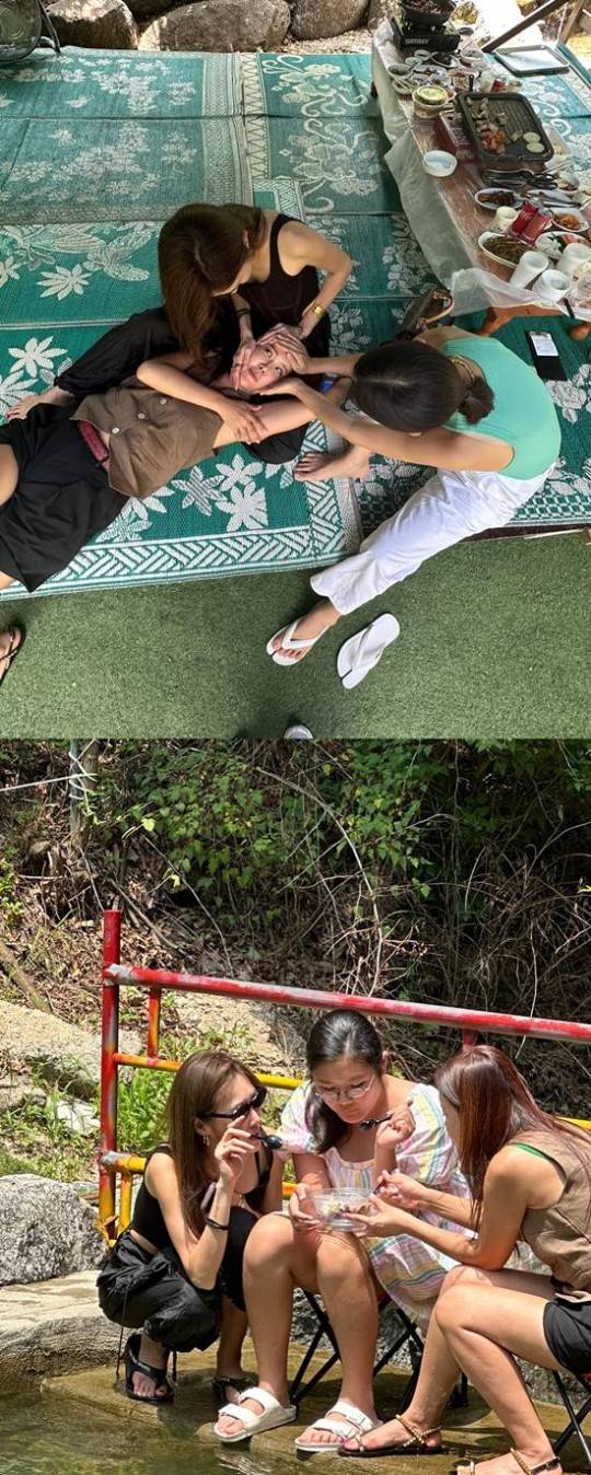 윤혜진과 절친한 사이인 가수 백지영 또한 지온 양과 함께한 사진을 업로드했는데요... 계곡처럼 보이는 장소에서 의자에 앉아있는 엄지온 양에게 백지영과 윤혜진이 말을 거는 듯한 다정하고 행복한 모습을 보여주고 있습니다.