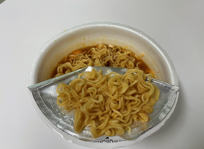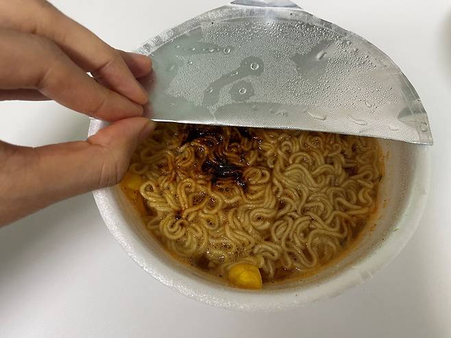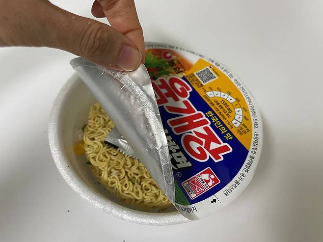 이렇게 하면 그릇이나 종이컵 없이도 면을 건져서 식혀먹는 앞접시 역할을 톡톡히 하게 됩니다. 컵라면 용기와 뚜껑이 하나로 연결된 일체형 구조라 뚜껑이 바닥으로 떨어지거나 이리저리 굴러다닐 걱정이 없고, 좁은 책상이나 야외 벤치에서도 공간을 차지하지 않아 매우 효율적입니다.