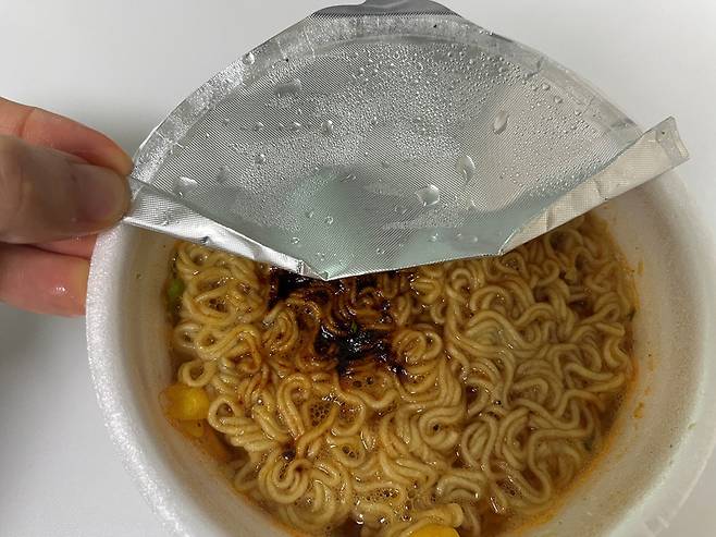 컵라면 드실 때, 앞접시 없이도 편하게 먹고 싶다면 이 윗부분의 "뚜껑"을 절대 떼서 버리지 마세요. 정확히 절반 정도만 조심스럽게 개봉해 줍니다. 면이 익을 때까지 평소처럼 뚜껑을 덮어 두세요.