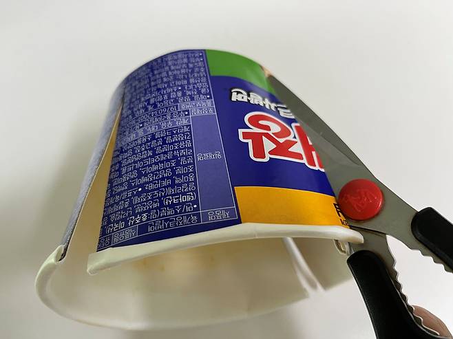 씻어낸 컵라면 용기를 가위로 여러 등분으로 자릅니다. 동그란 형태 그대로 버리면 쓰레기봉투 안에서 불필요한 공간을 너무 많이 차지하지만, 이렇게 잘라내면 부피가 반 이상 줄어듭니다.