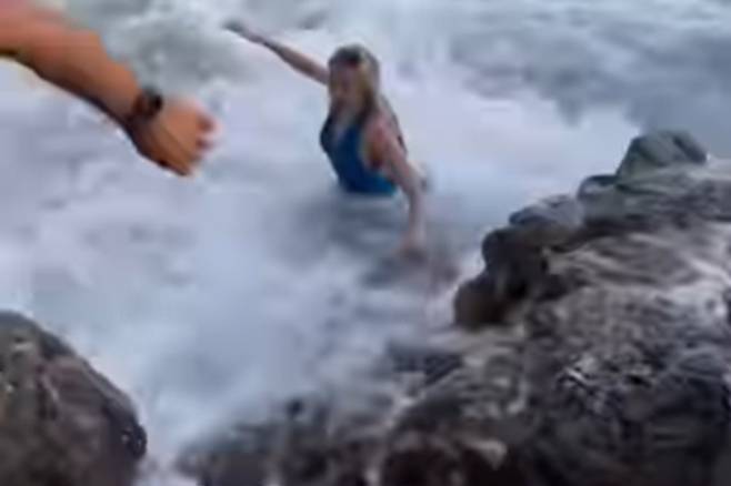 갑자기 높은 파도가 치면서 여성은 중심을 잃고 넘어졌고 파도에 휩쓸렸죠. 여성은 중심을 잡지 못하고 바다에서 허우적거리다 바위를 붙잡았는데요.