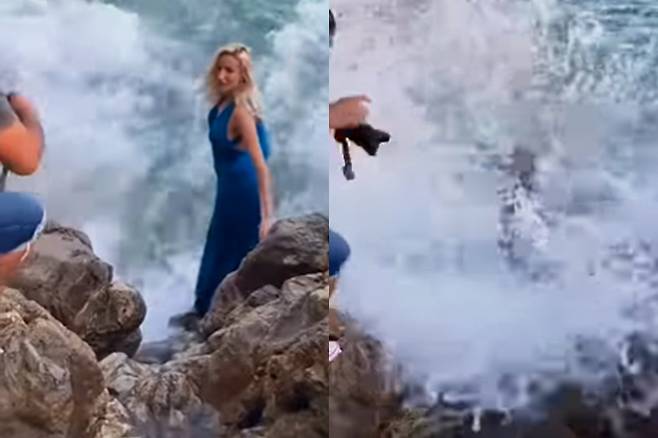 영상 속 여성은 사진을 찍기 위해 파도치는 바다에 들어가 포즈를 취하고 있었는데요.