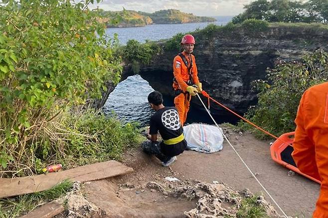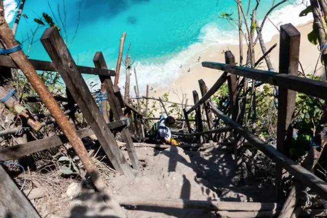 인도네시아의 현지 관광객 2명과 현지 가이드 1명이 절벽 계단을 타고 해변에 내려갔는데요.