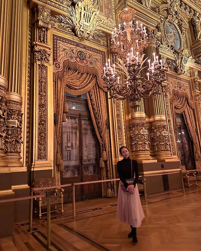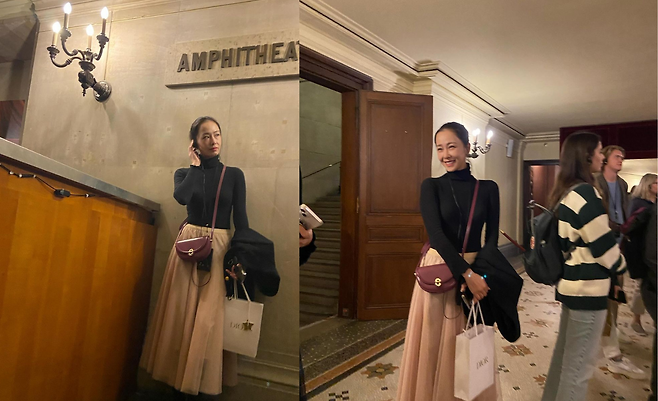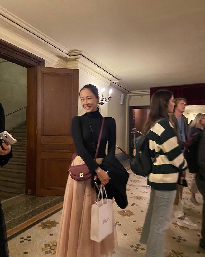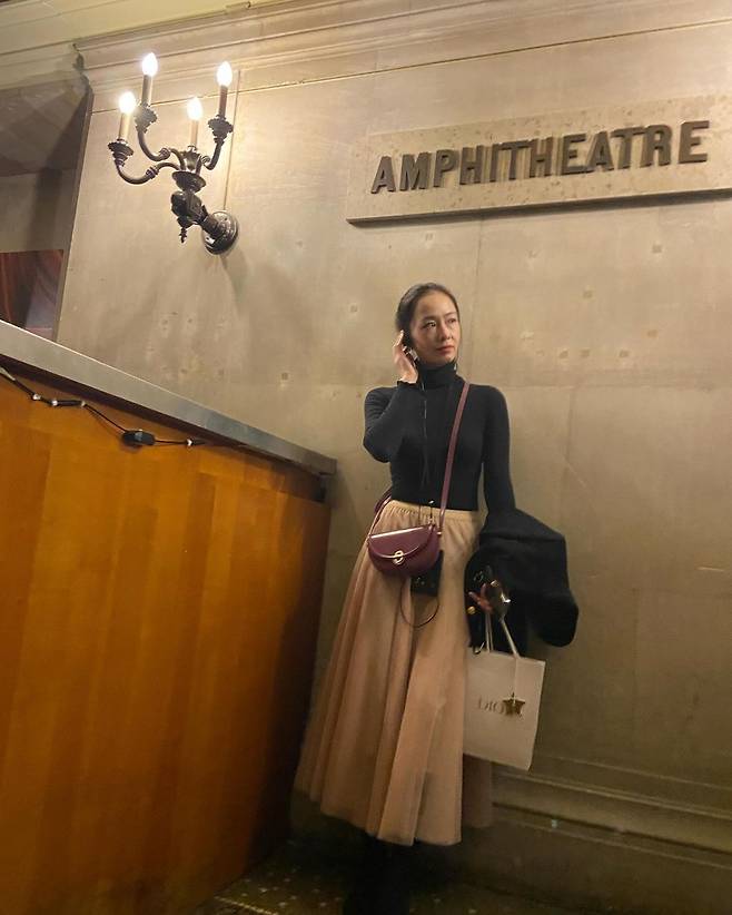 사진 속 홍수현은 블랙 터틀넥 티를 입고 베이지톤은 롱 플레어 스커트를 입고
