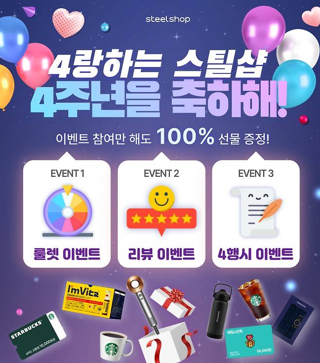 스틸샵은 오픈 4주년을 맞아 회원사 성원에 보답하기 위해 '꽝' 없는 이벤트를 마련했다. 참여만 해도 소정의 선물을 받을 수 있다.
