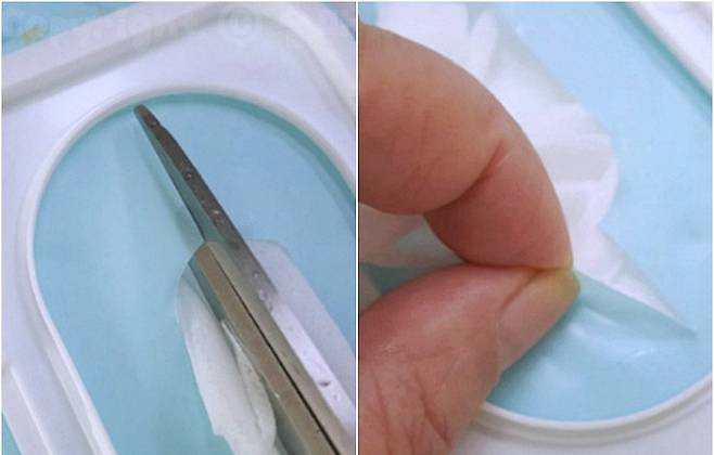 이럴 때 물티슈 입구 양쪽 끝을 가위로 잘라보세요. 그러면 뽑는 입구 부분이 넓어지게 되는데요.