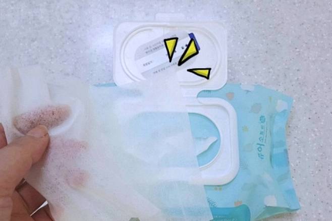하지만 알고 보면 물티슈 캡이 아래로 가게 뒤집어 놓아야 한다는데요. 물티슈 판매자분이 알려주시길 이렇게 하면 물기가 마르지 않고 오래간다고 합니다.