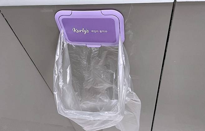 바로 싱크대 미니 쓰레기통으로 활용하시면 좋은데요. 물티슈캡을 한켠에 붙여 두시고 비닐봉지를 끼워 보세요