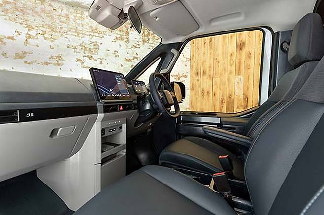 카고, 크루, 섀시 캡 모델은 모두 다크 블루 패브릭으로 마감된 운전석 및 동승석 2인용 좌석이 제공되며, 12.9인치 중앙 디스플레이(안드로이드 오토모티브 OS 기반)와 무선 애플 카플레이·안드로이드 오토를 지원한다. 운전자는 7.5인치 디지털 계기판을 통해 최소한의 시선 분산으로 주요 정보를 확인할 수 있다.