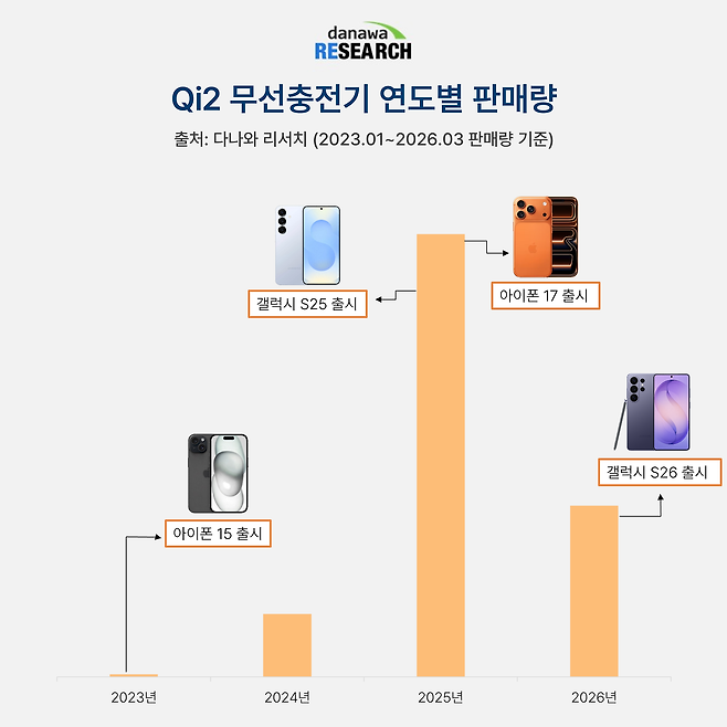 2023년 Qi2 인증 공개와 함께 Qi2를 지원하는 아이폰 15 시리즈가 출시되면서 Qi2 무선충전기 시장의 포문을 열었다. 여기에 2025년에는 갤럭시 S25 시리즈에서 Qi2를 탑재하고, Qi2.2를 지원하는 아이폰 17 시리즈까지 나오면서 수요가 증가했다. 즉, 고속 충전기의 수요는 충전을 지원하는 디바이스의 출시 여부가 중요하다고 추측할 수 있다.