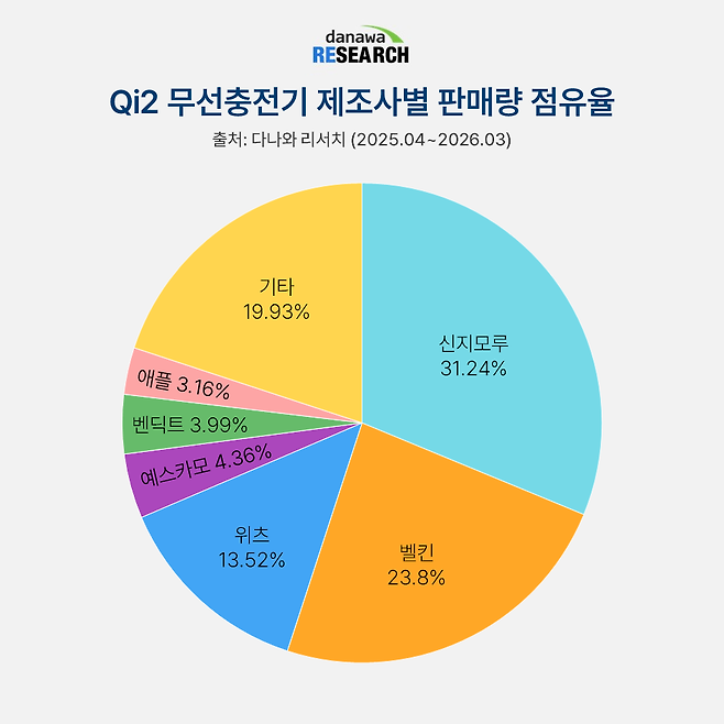 최근 1년 간의 다나와 리서치 데이터를 살펴보면, Qi2 무선충전기 시장은 신지모루와 벨킨이 시장의 절반 이상을 점유하며 주도하고 있다. 이어 위츠(13.52%), 예스카모(4.36%), 벤딕트(3.99%), 애플(3.16%) 순으로 점유율을 기록했다.