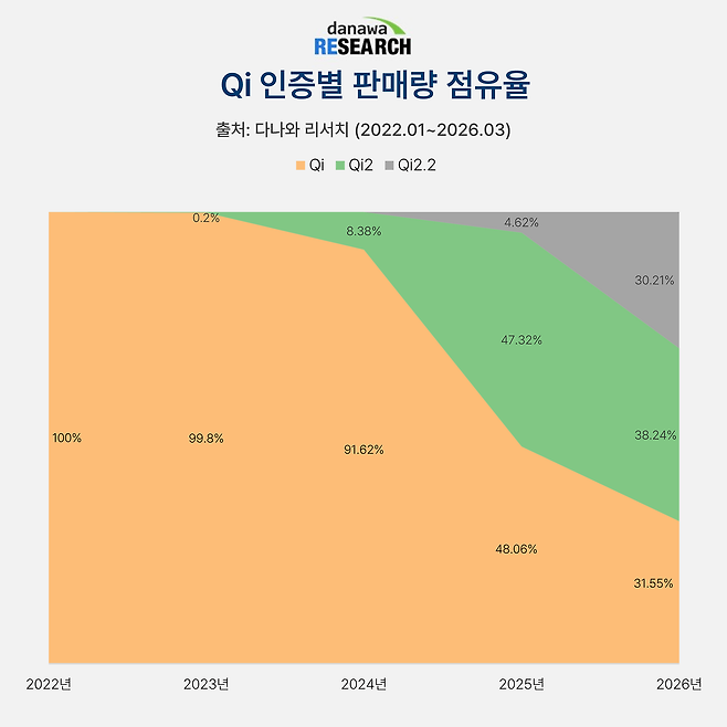2025년 하반기에 공개된 Qi2.2가 2026년 30.21%의 점유율을 차지한 점도 눈에 띈다. 아이폰 16, 17 시리즈, 갤럭시 S26 울트라 모델에서 Qi2.2를 지원해 Qi2.2 무선충전기 수요가 늘어났다고 볼 수 있다.