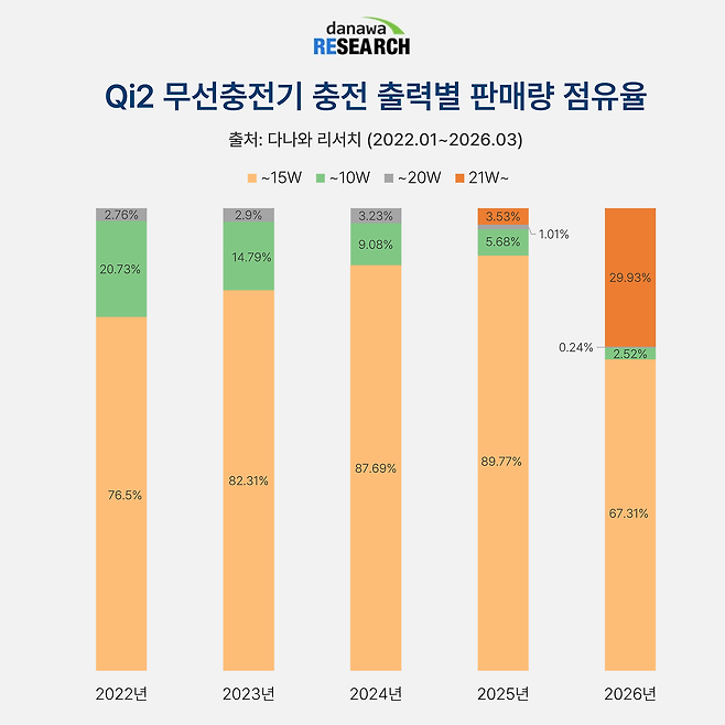 매년 성장세를 보이던 '~15W' 구간이 올해부터 67.31%로 급격히 떨어졌다. 그 배경에는 Qi2.2가 있다. 2025년부터 무선충전 최대 25W를 지원하는 Qi2.2 무선충전기가 시장에 등장했다. 게다가 2026년 초 출시된 갤럭시 S26 울트라 모델부터 최대 25W 무선충전이 가능해 '21W~' 충전 출력의 수요도 덩달아 늘어났다. 앞으로 '21W~' 충전 출력이 뉴노멀로 자리잡을 가능성이 높다.
