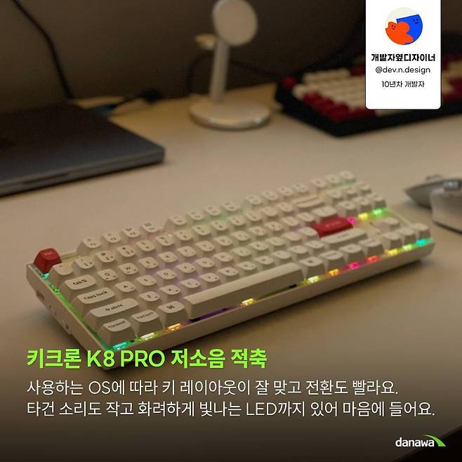A : 저는 사무실, 집, 휴대 목적에 따라 키보드를 다양하게 사용하는데요. 키크론 K8은 사무실에서 사용하려고 구매했죠. 평소에 맥북과 리눅스를 번갈아 사용하는데 이 제품은 OS에 따라 전환도 빠르고 키 레이아웃이 잘 맞아요. 사무실에서 사용해야 하니 소음이 중요한데 저소음 모델이라 조용해요. 화려하게 빛나는 LED도 마음에 들어 요즘에는 이 키보드에 정착했답니다.