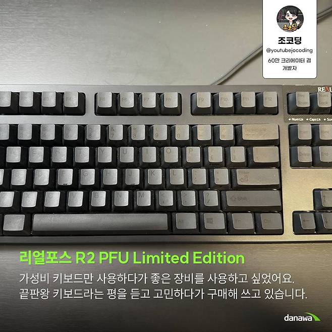 A : 가성비 키보드만 사용하다가 작업을 오래 하는 만큼 좋은 장비를 써보고 싶었어요. 관련해서 제품을 찾아보다가 리얼포스가 끝판왕이라는 평을 듣게 되었죠. 막손인지라 사실 그렇게 좋아진 체감은 들진 않지만 그래도 만족하면서 사용하고 있습니다.