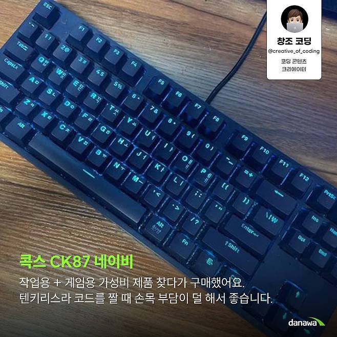 A : 지금으로부터 3년 전에 키보드 구매하려고 했을 때 주변으로부터 추천받아 구매했는데요. 처음에는 게미밍 목적으로 구매했다가 텐키리스 구조이다 보니 코딩 작업할 때 손목에 부담이 덜 가고 색상이나 가격적인 면도 마음에 들어서 계속 쓰고 있습니다.