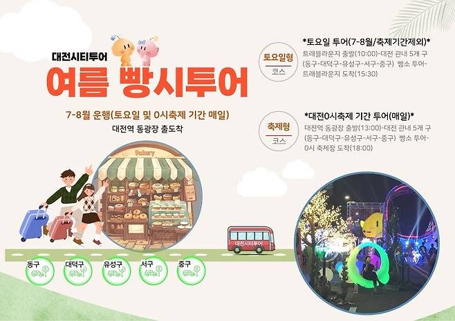 오후 1시에 대전역 동광장에서 출발하며, 오후 6시 이후 자연스럽게 0시 축제장으로 연계되어 관광 후 저녁 공연과 퍼레이드를 즐길 수 있도록 구성됐다.