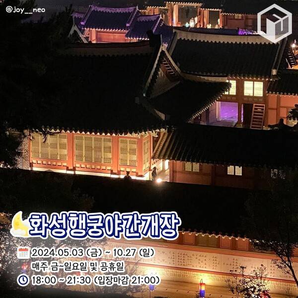 2024년 수원 화성행궁 야간개장은 5월 3일 금요일부터 10월 27일 일요일까지 약 5달 간 운영됩니다. 야간개장 기간 내 매주 금요일부터 일요일 및 공휴일 오후 6시부터 9시 30분까지 화성행궁 야간 관람이 가능한 것인데요. 입장 마감은 오후 9시까지이니 방문에 참고하시면 되겠습니다.