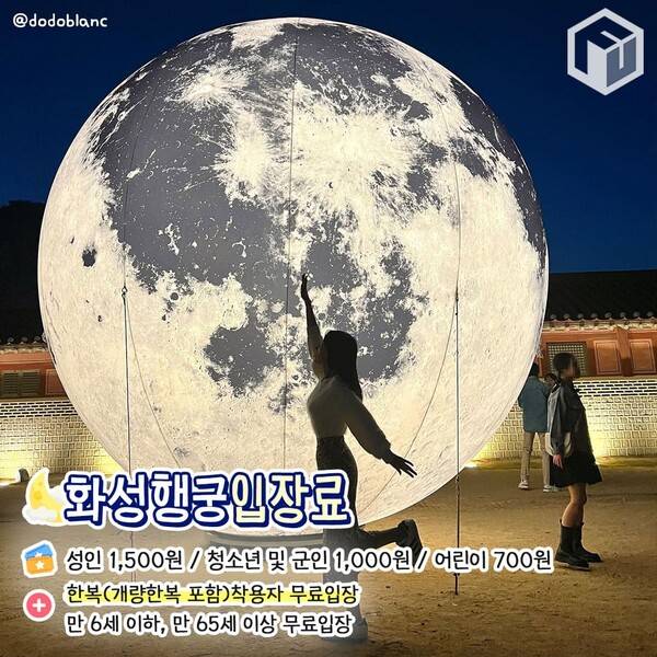 화성행궁 야간개장 입장료는 성인 1,500원, 청소년 및 군인 1,000원, 어린이 700원입니다. 무료입장 대상자는 개량한복을 포함한 한복 착용자, 만 6세 이하 및 만 65세 이상의 미취학 아동과 고령자이니 방문 시 참고하시면 되겠습니다.